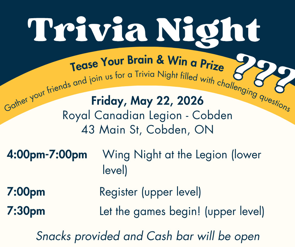 Both events will be held at the Cobden Legion, 43 Main Street, Cobden, ON. The book sale is on the lower level and the trivia will be on the upper level (elevator available).