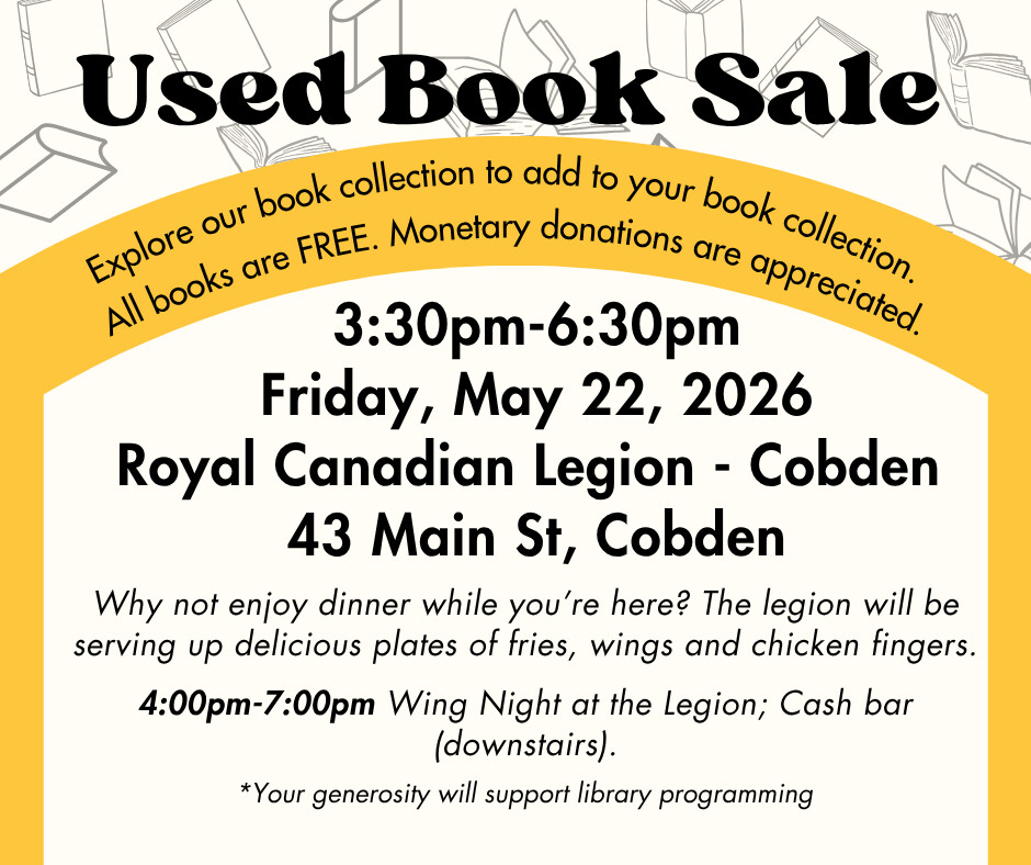 Join us on the second Wednesday of the month for the Cobden Book Club. The group meets from 6:30 pm to 7:30 pm. We would love to see you there!